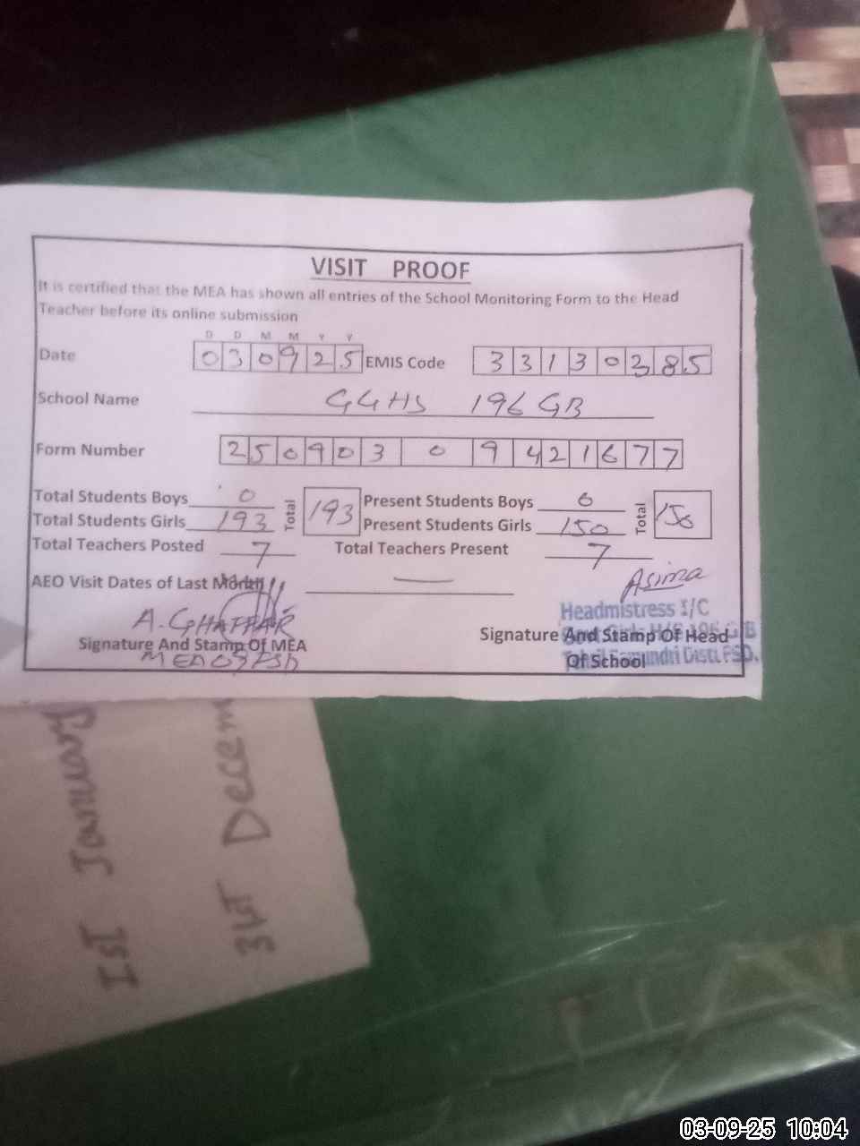 | Attendance Register | Head Teacher | MEA with School | Visit Proof |