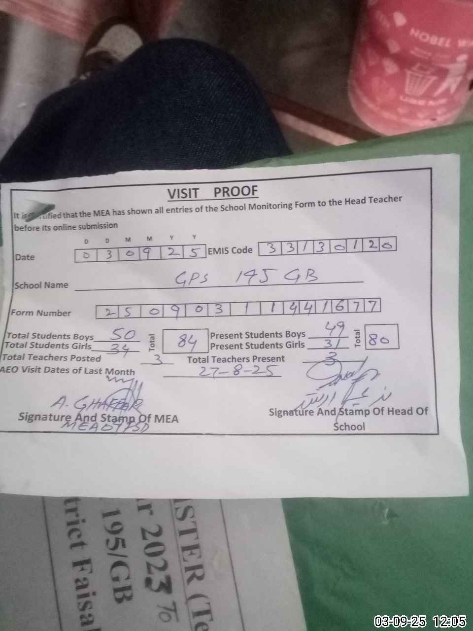 | Attendance Register | Head Teacher | MEA with School | Visit Proof |