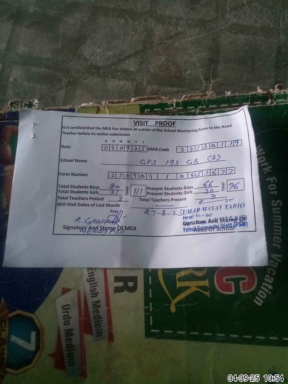| Attendance Register | Head Teacher | MEA with School | Visit Proof |