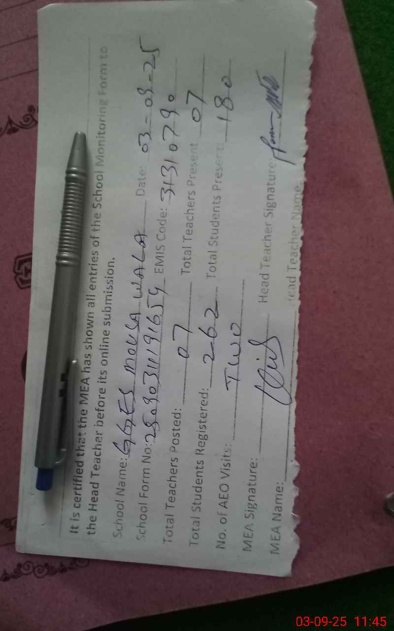 | Attendance Register | Head Teacher | MEA with School | Visit Proof |