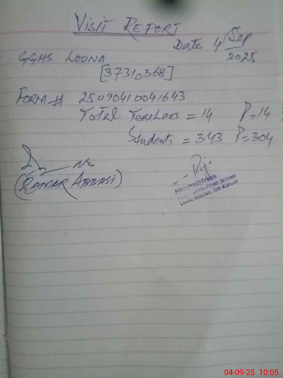| Attendance Register | Head Teacher | MEA with School | Visit Proof |
