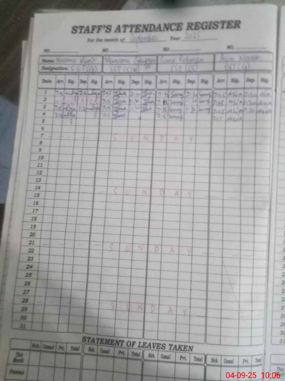 | Leave | Duty | Absent | Maternity | Medical | Ex- Pak |