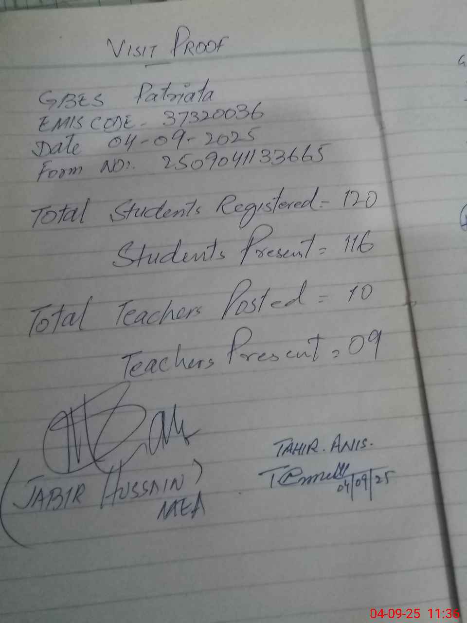 | Attendance Register | Head Teacher | MEA with School | Visit Proof |