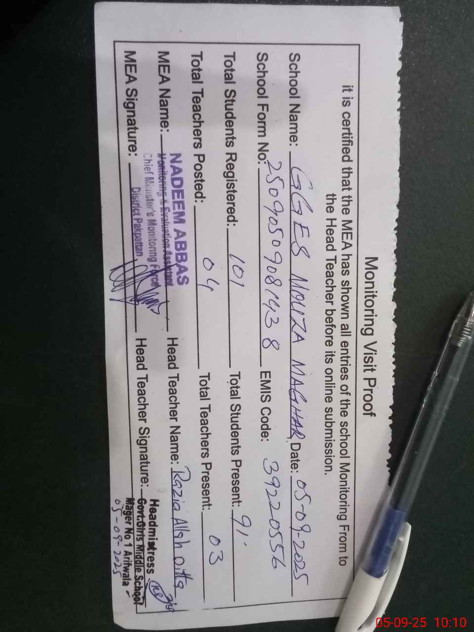 | Attendance Register | Head Teacher | MEA with School | Visit Proof |