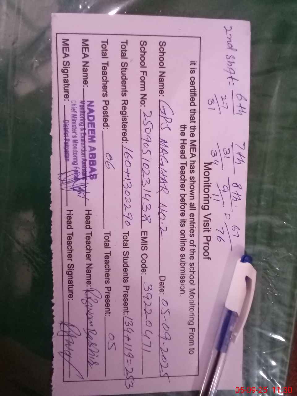 | Attendance Register | Head Teacher | MEA with School | Visit Proof |