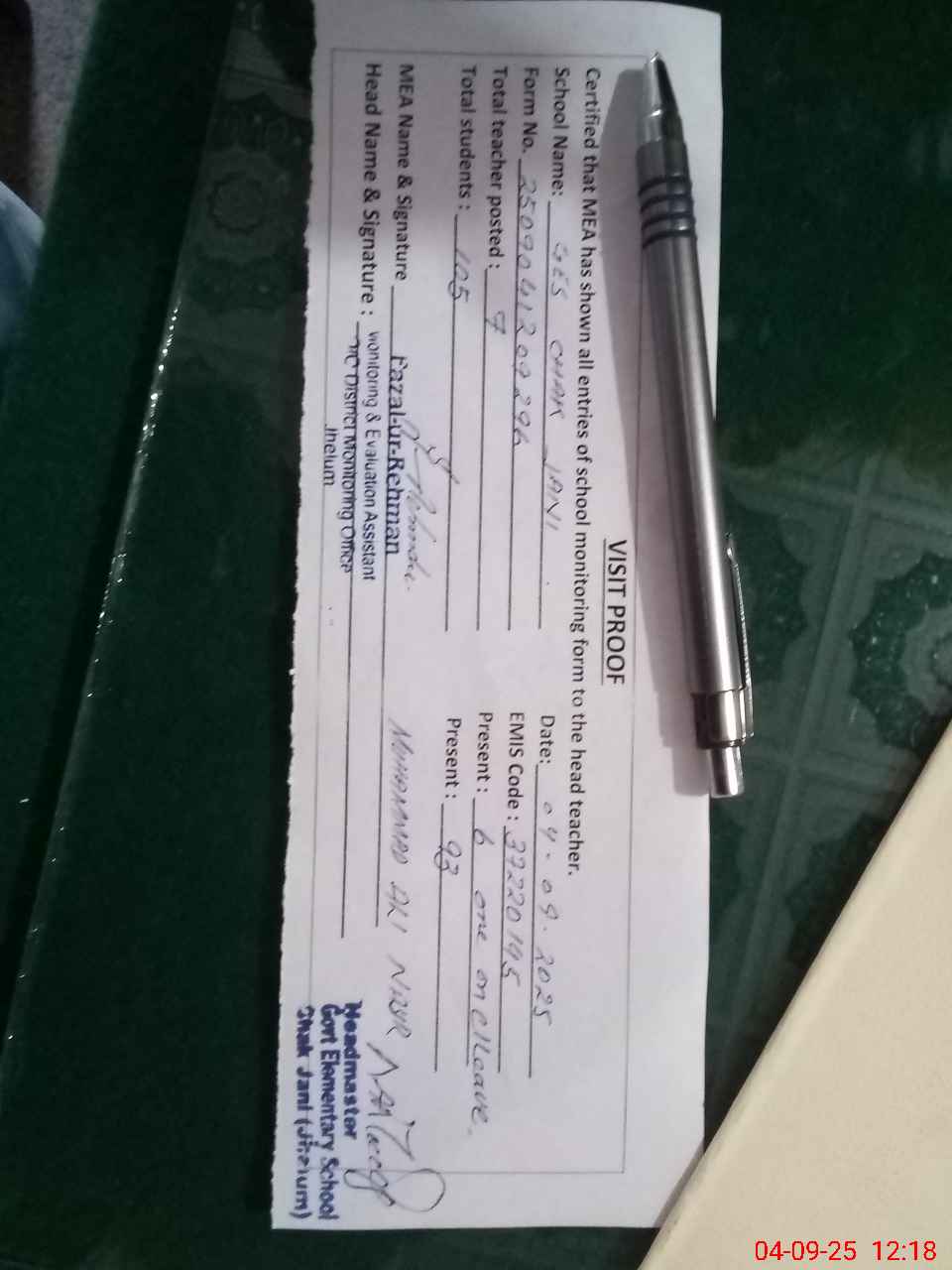 | Attendance Register | Head Teacher | MEA with School | Visit Proof |
