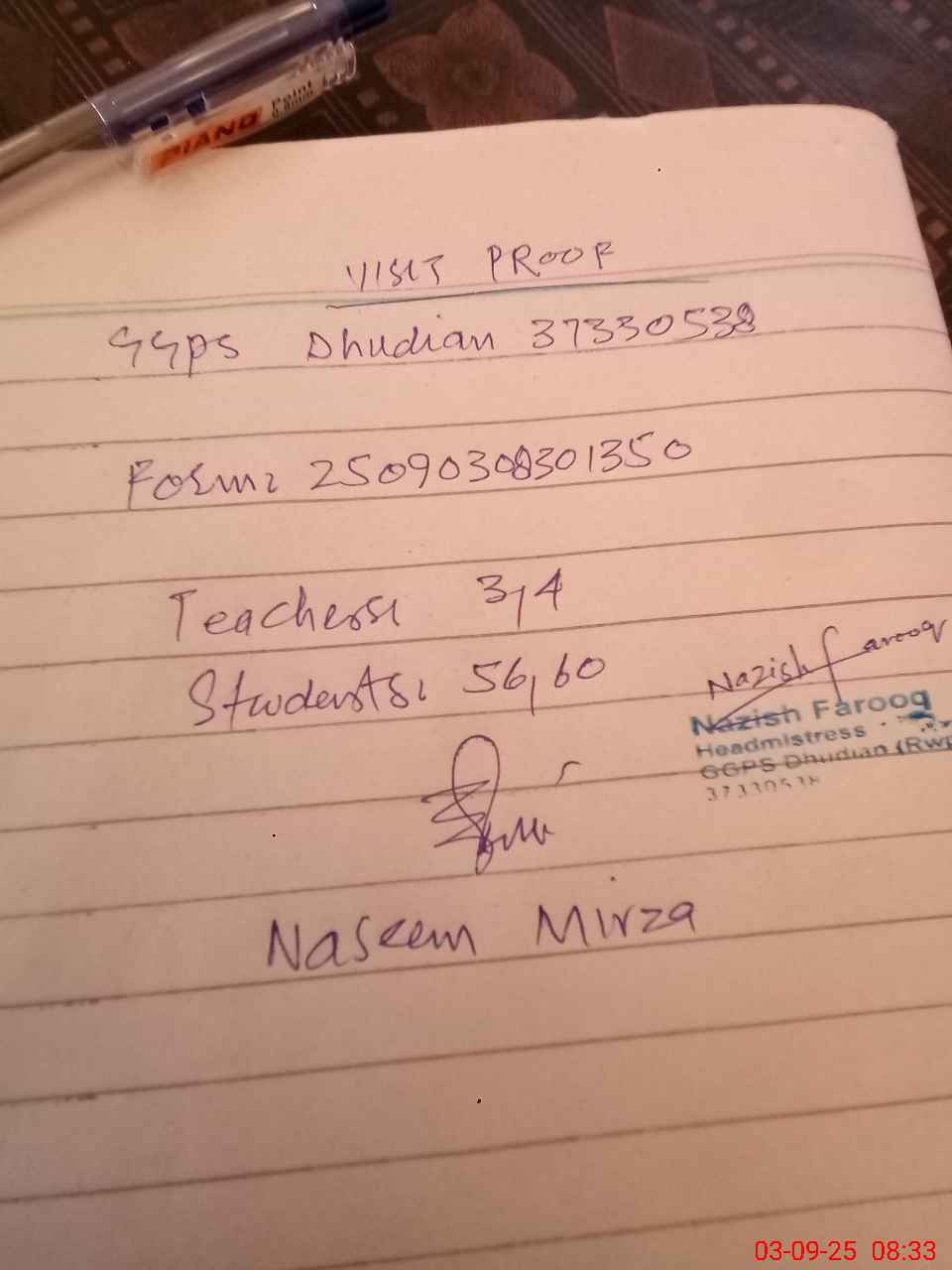 | Attendance Register | Head Teacher | MEA with School | Visit Proof |