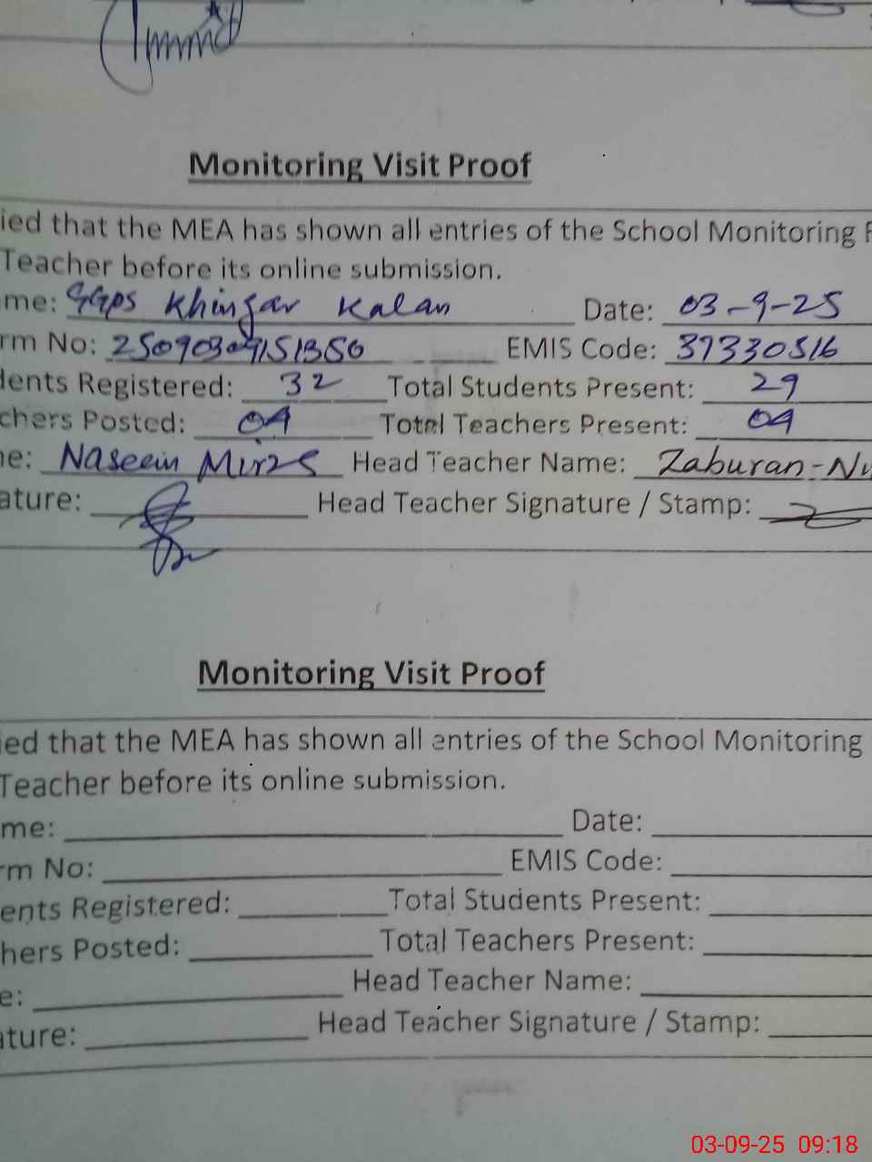 | Attendance Register | Head Teacher | MEA with School | Visit Proof |