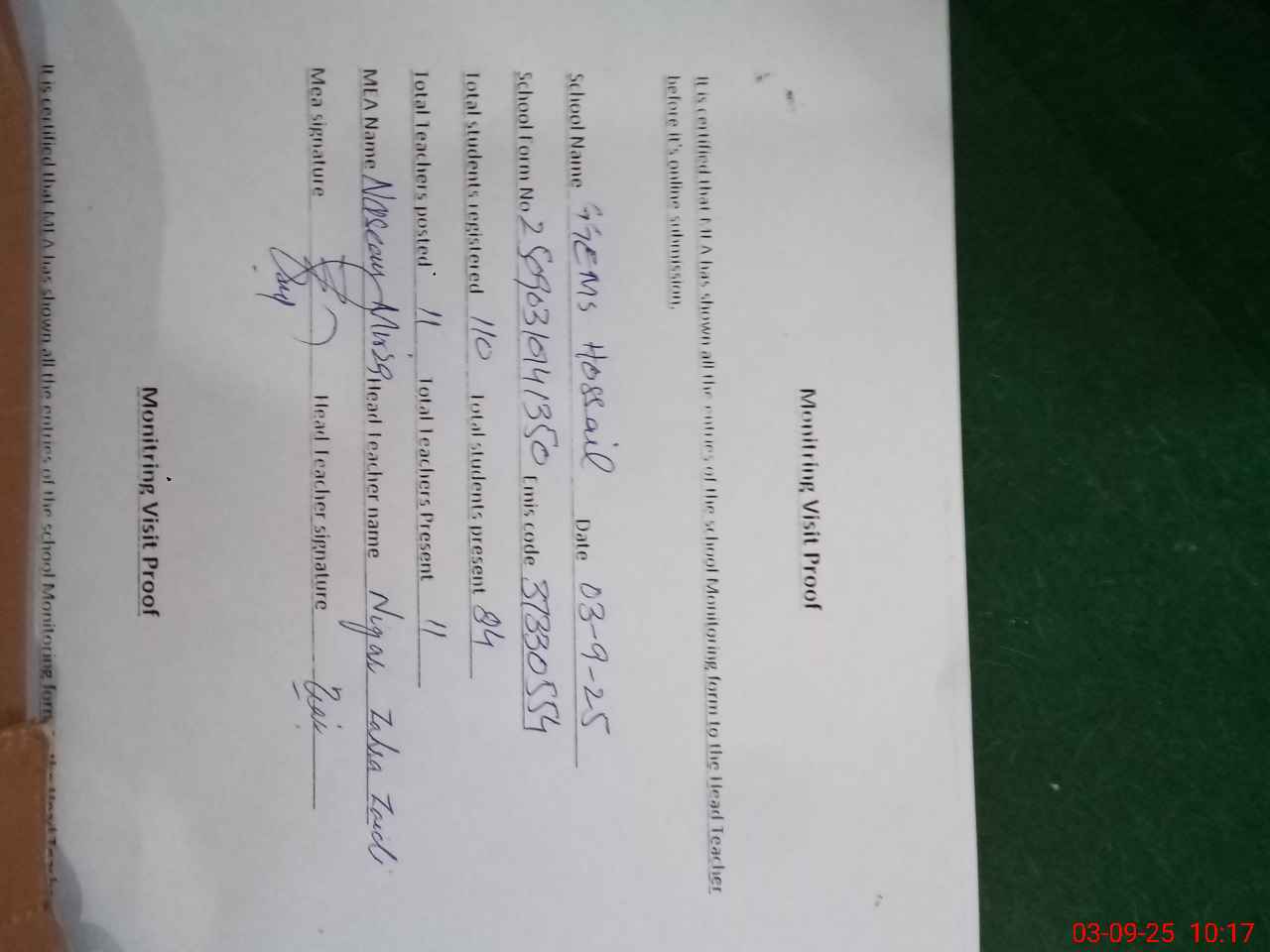 | Certified that this School was Inspected by the Undersigned MEA/DMO Today and the Information Stated Above is as Per Record. | |||||