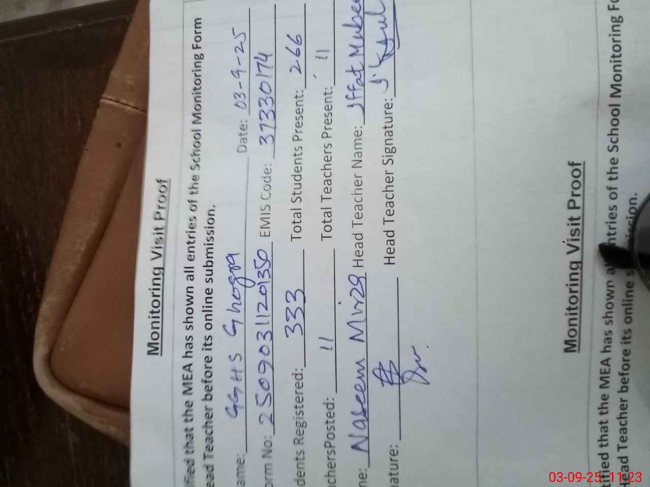 | Attendance Register | Head Teacher | MEA with School | Visit Proof |