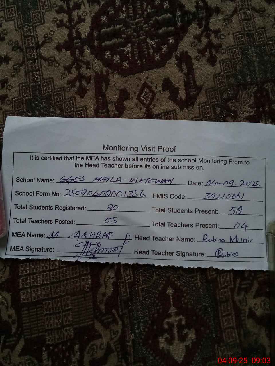 | Attendance Register | Head Teacher | MEA with School | Visit Proof |