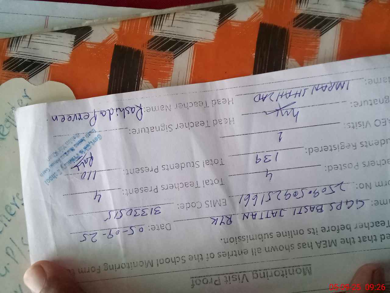 | Attendance Register | Head Teacher | MEA with School | Visit Proof |