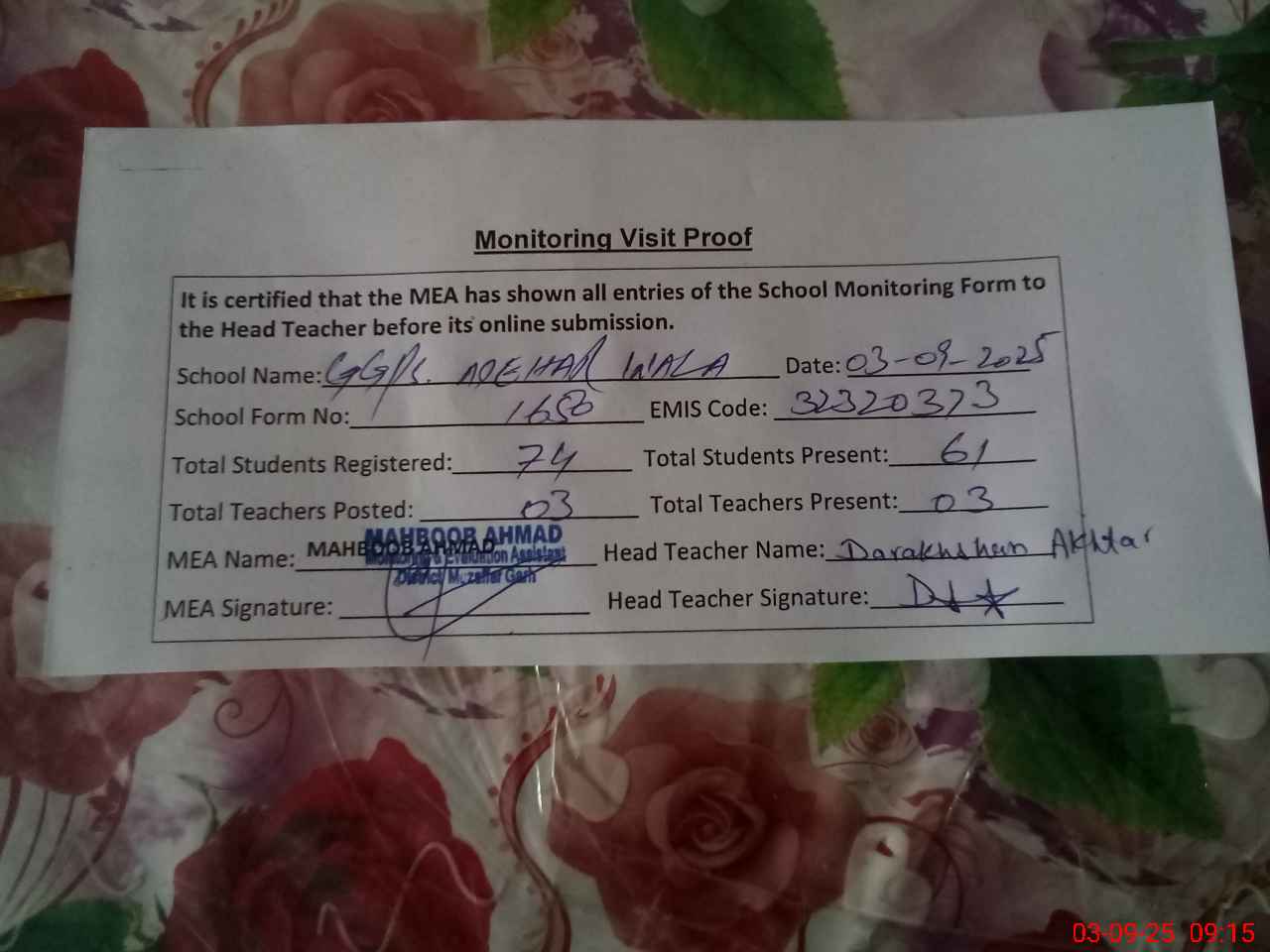 | EMIS Code: 32320373 | Name of School: GGPS MEHAR WALA | |||