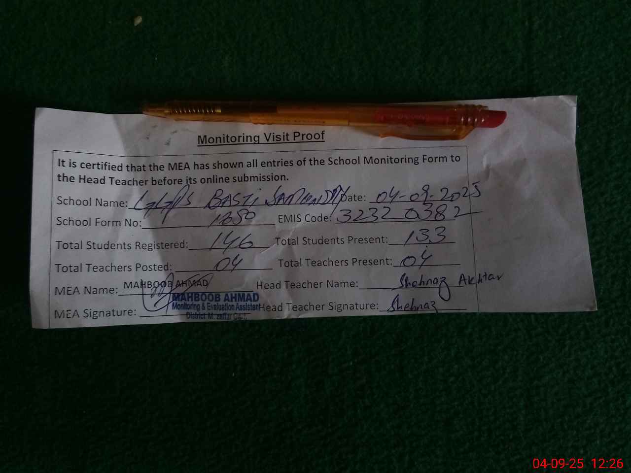 | Monitoring Date: 04-09-2025 | Start Time: 04-09-2025 11:51 AM | End Time: 04-09-2025 12:27 PM | Name of MEA: MA**** AH**** | |