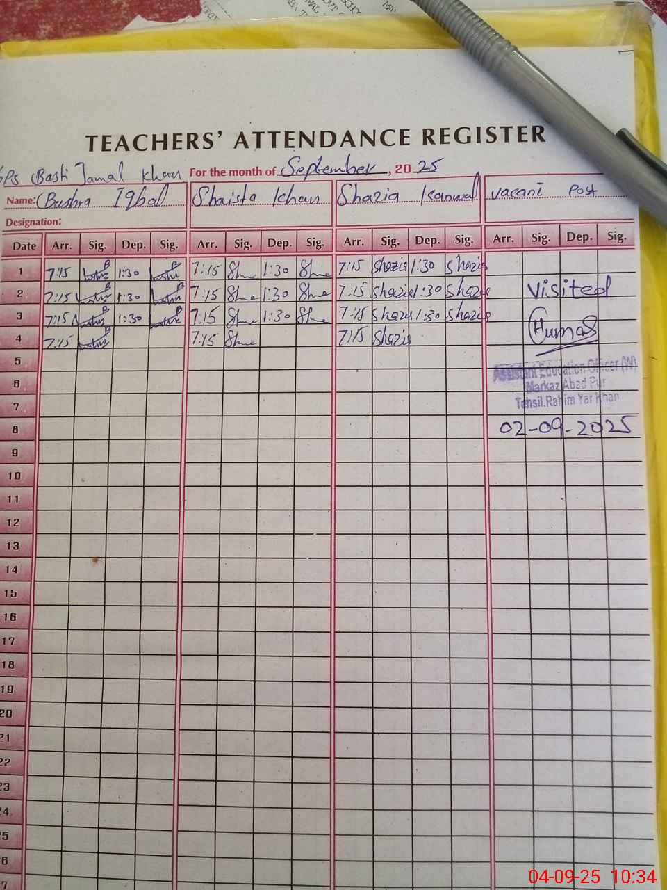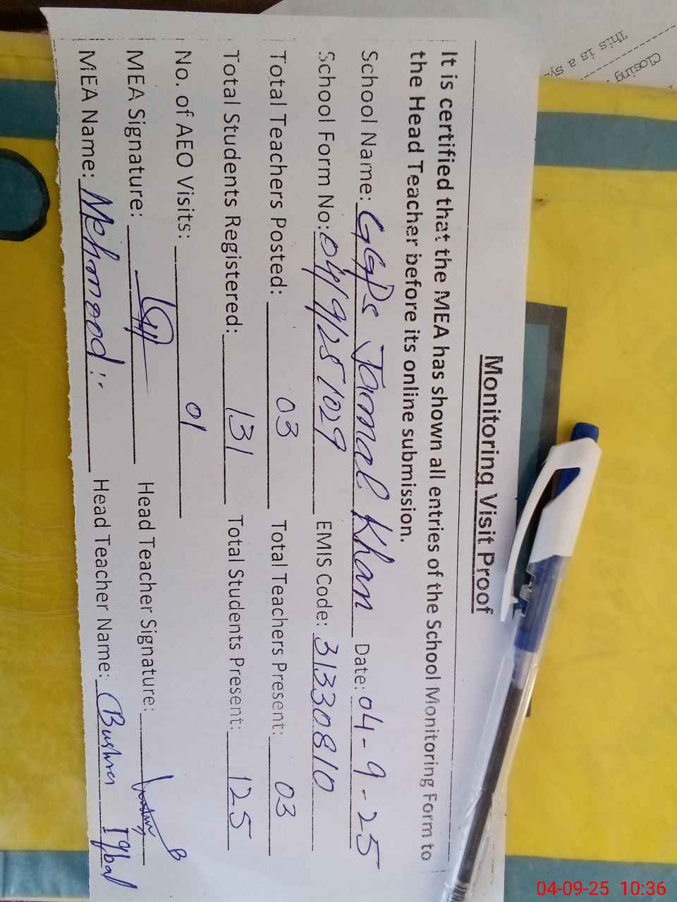 | Attendance Register | Head Teacher | MEA with School | Visit Proof |