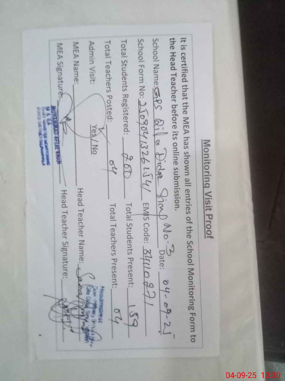 | Attendance Register | Head Teacher | MEA with School | Visit Proof |