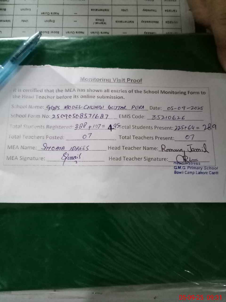 | Attendance Register | Head Teacher | MEA with School | Visit Proof |