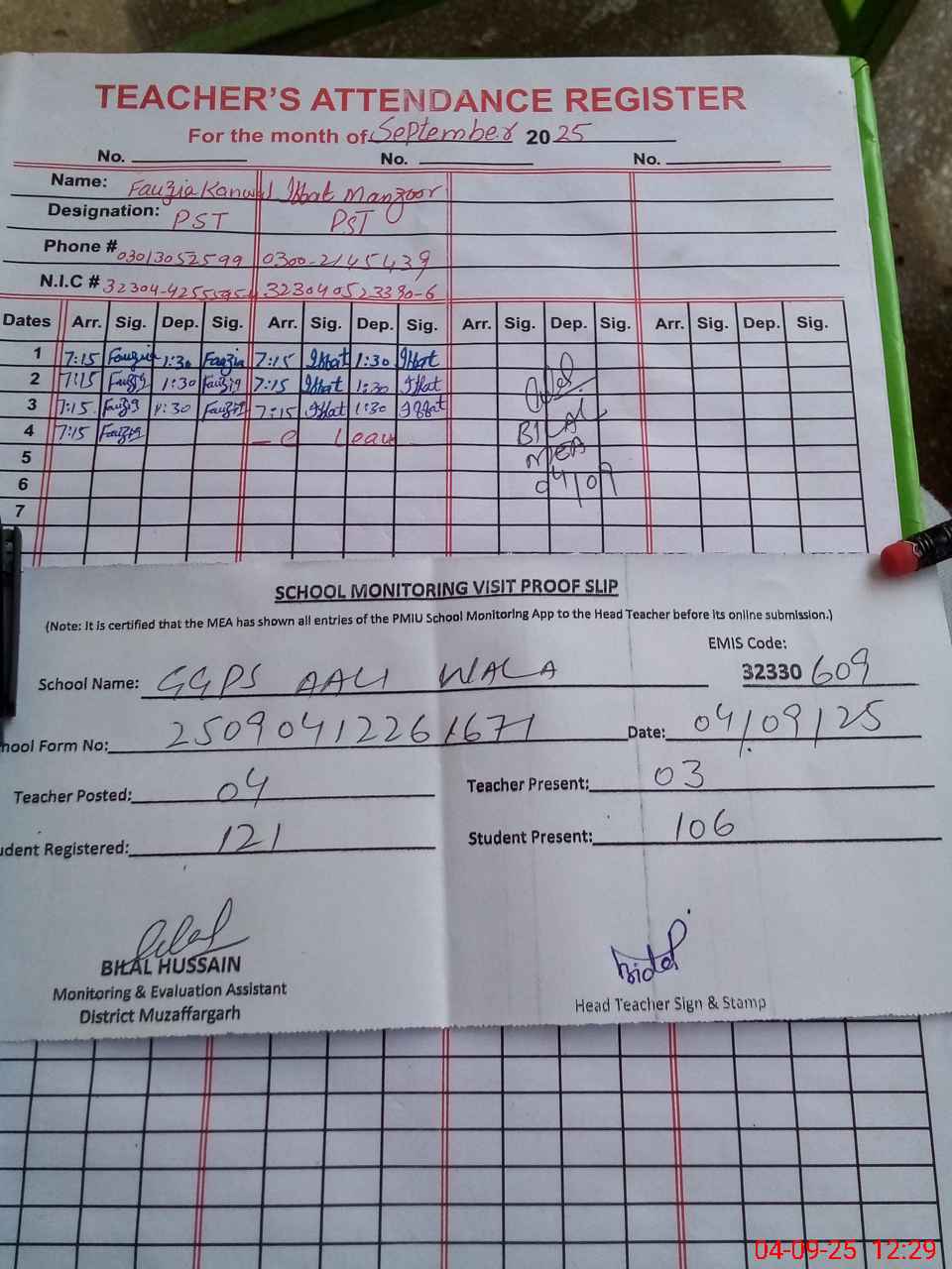 | Attendance Register | Head Teacher | MEA with School | Visit Proof |