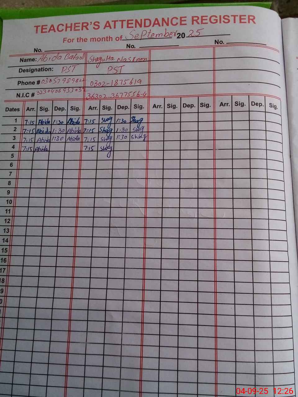 | Name: Ab**** Ba**** Designation: (School Headmaster's/Headmistress's) PST Phone/Cell Number: 03**** |