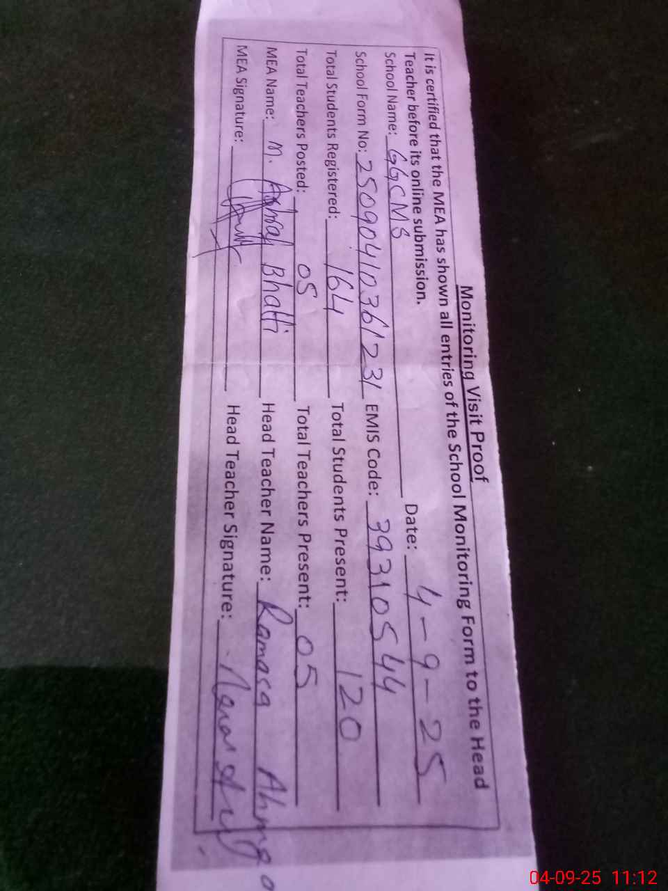 | Attendance Register | Head Teacher | MEA with School | Visit Proof |