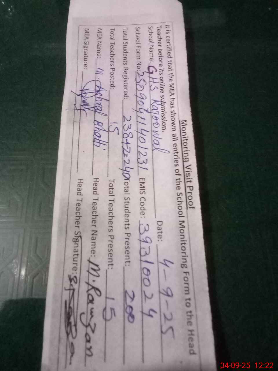 | Attendance Register | Head Teacher | MEA with School | Visit Proof |