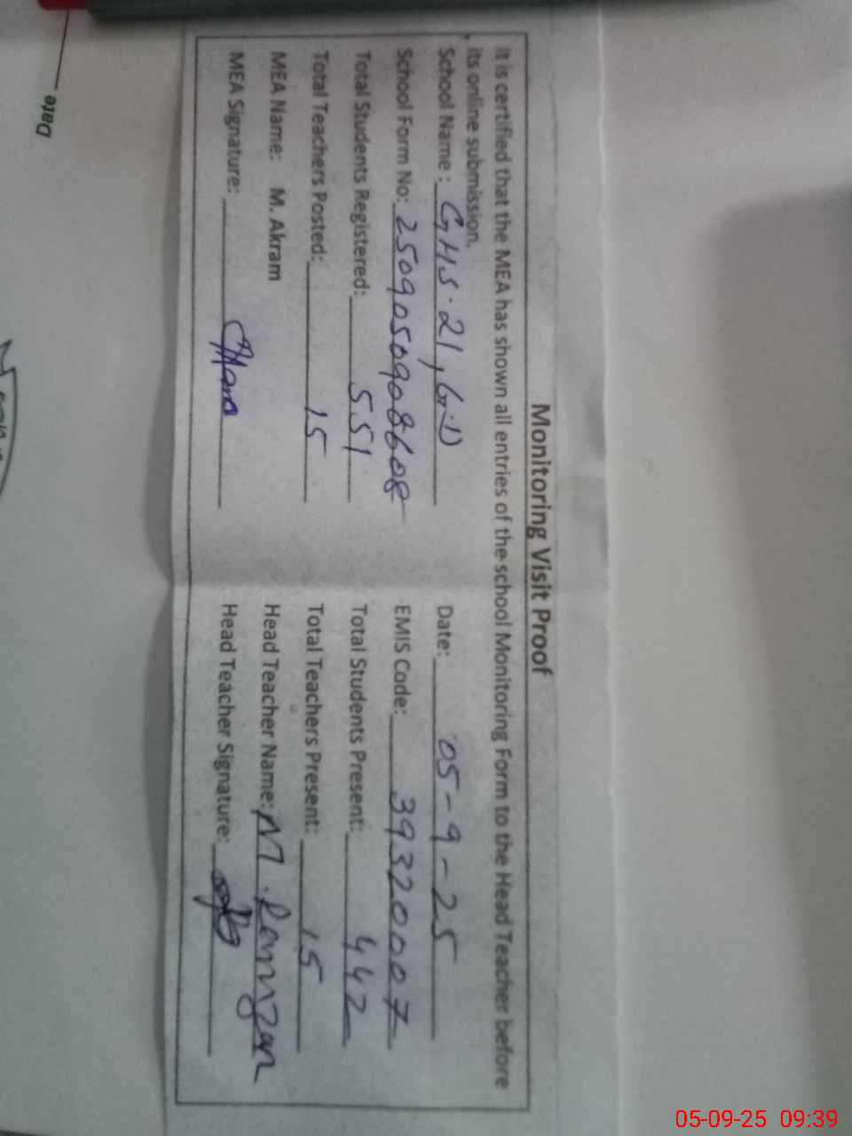 | EMIS Code: 39320007 | Name of School: GHS 21/G.D | |||