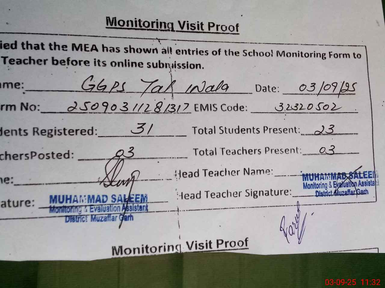 | EMIS Code: 32320502 | Name of School: GGPS TAL WALA | |||