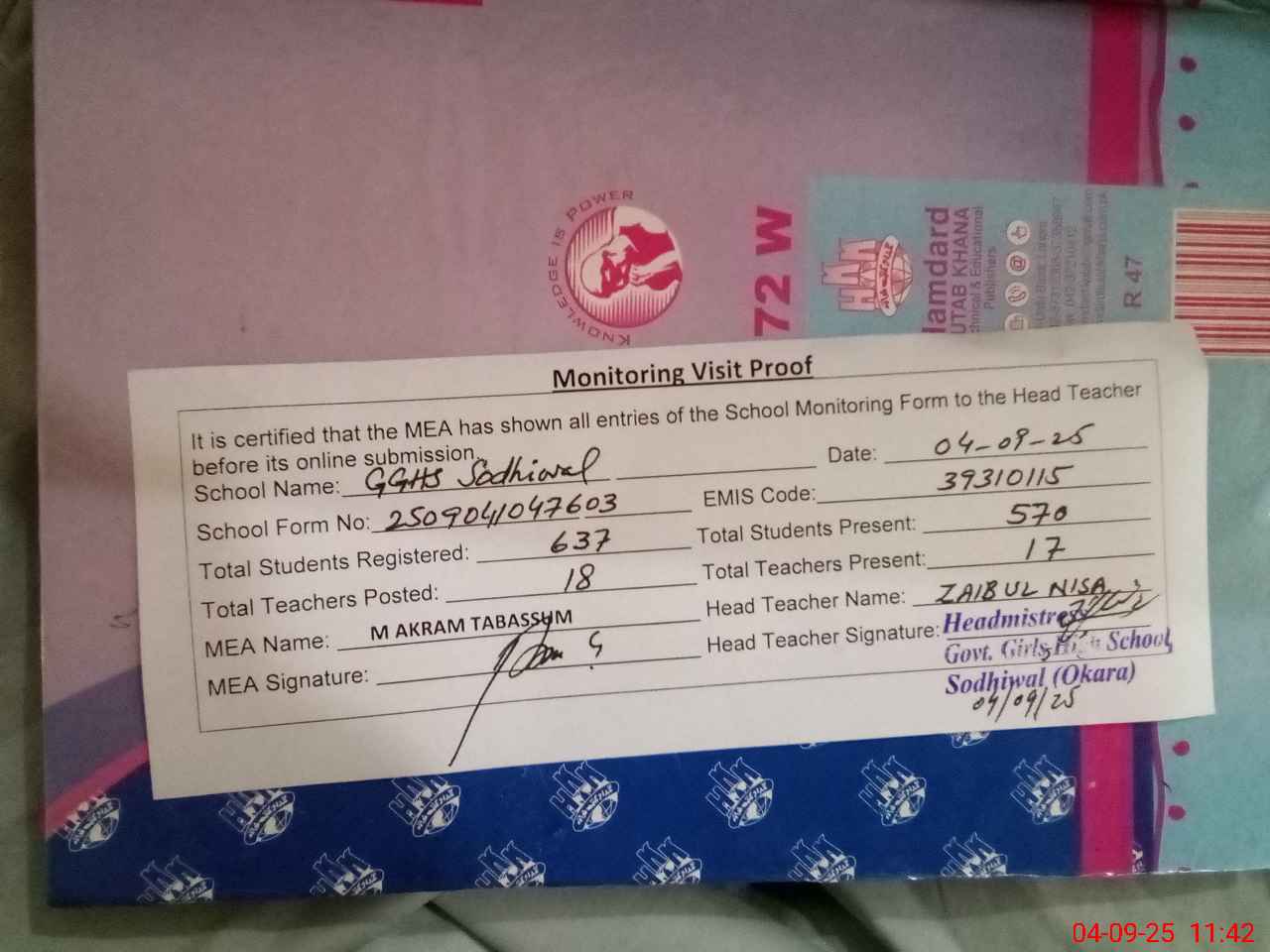 | Attendance Register | Head Teacher | MEA with School | Visit Proof |