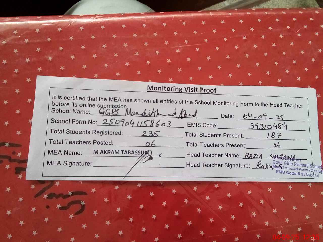 | EMIS Code: 39310484 | Name of School: GGPS MANDI AHMED ABAD | |||