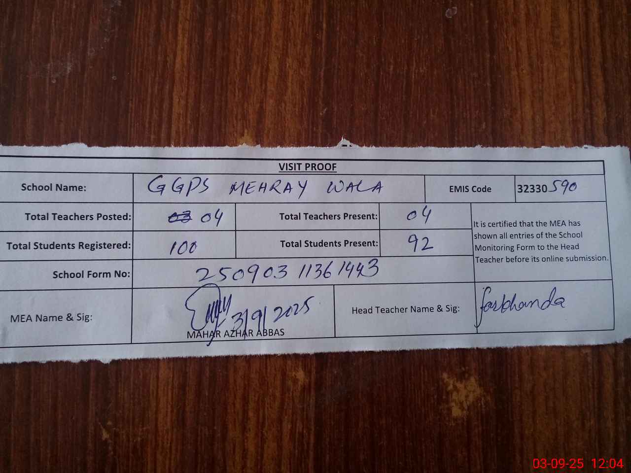 | Attendance Register | Head Teacher | MEA with School | Visit Proof |