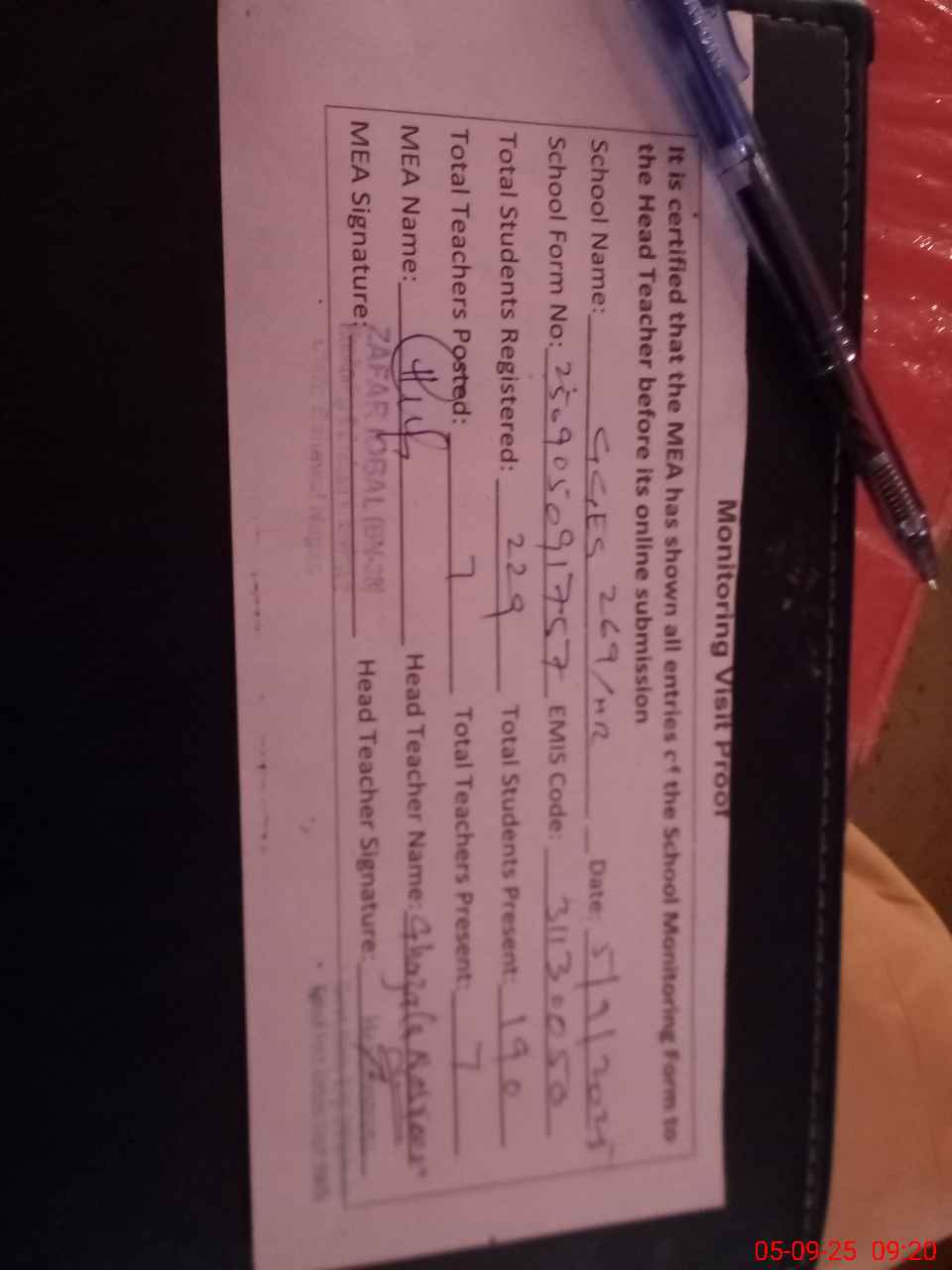 | Attendance Register | Head Teacher | MEA with School | Visit Proof |