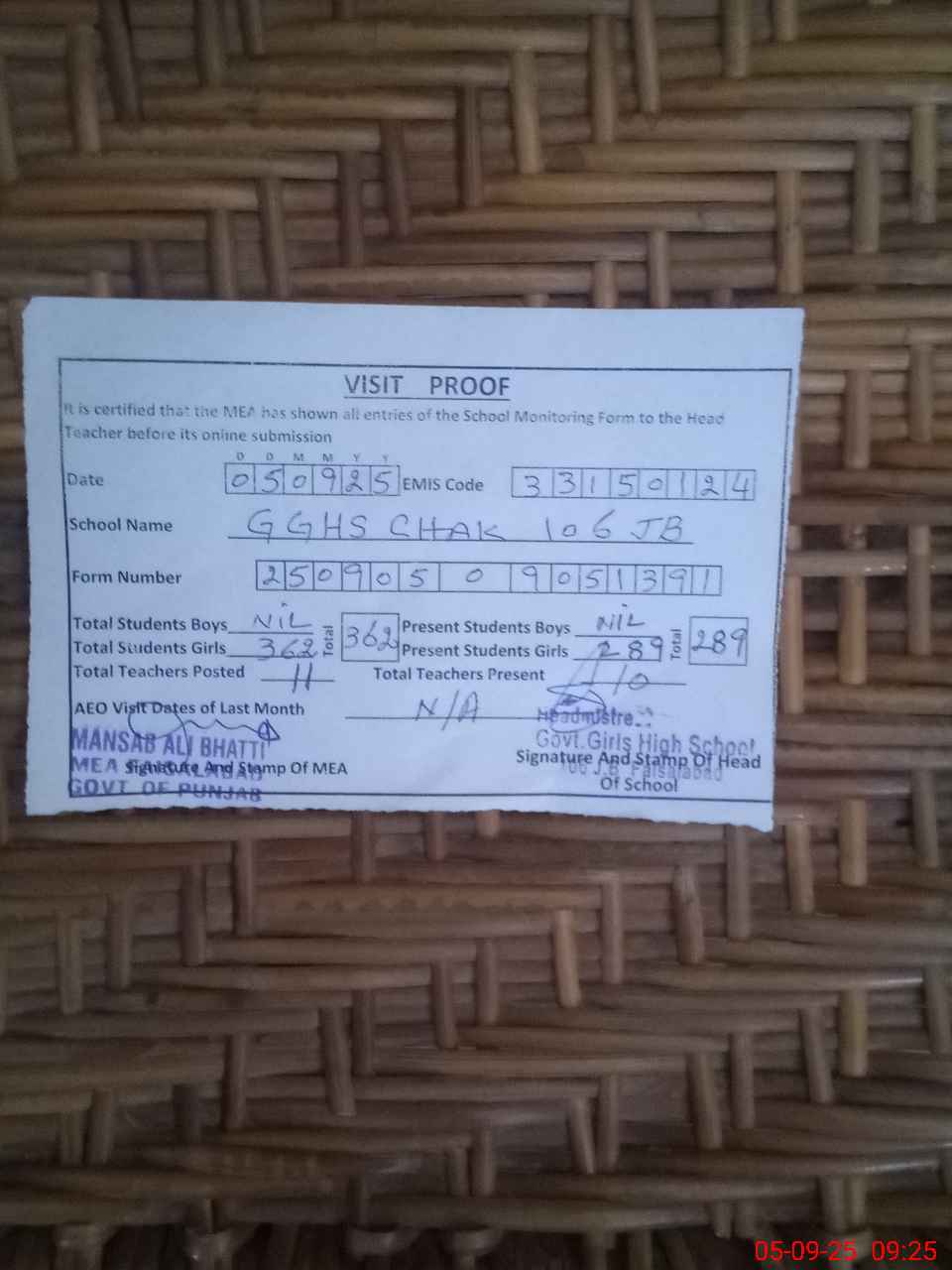 | EMIS Code: 33150124 | Name of School: GGHS CHAK 106 JB | |||