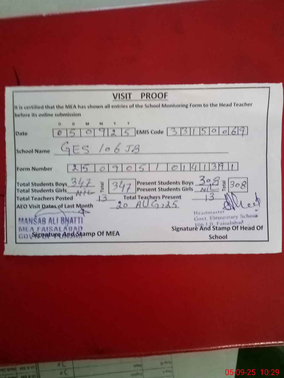 | Attendance Register | Head Teacher | MEA with School | Visit Proof |