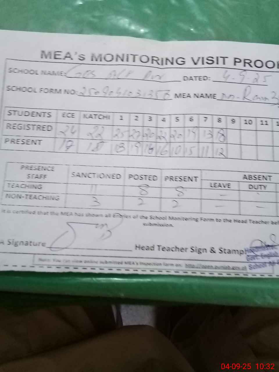 | Attendance Register | Head Teacher | MEA with School | Visit Proof |