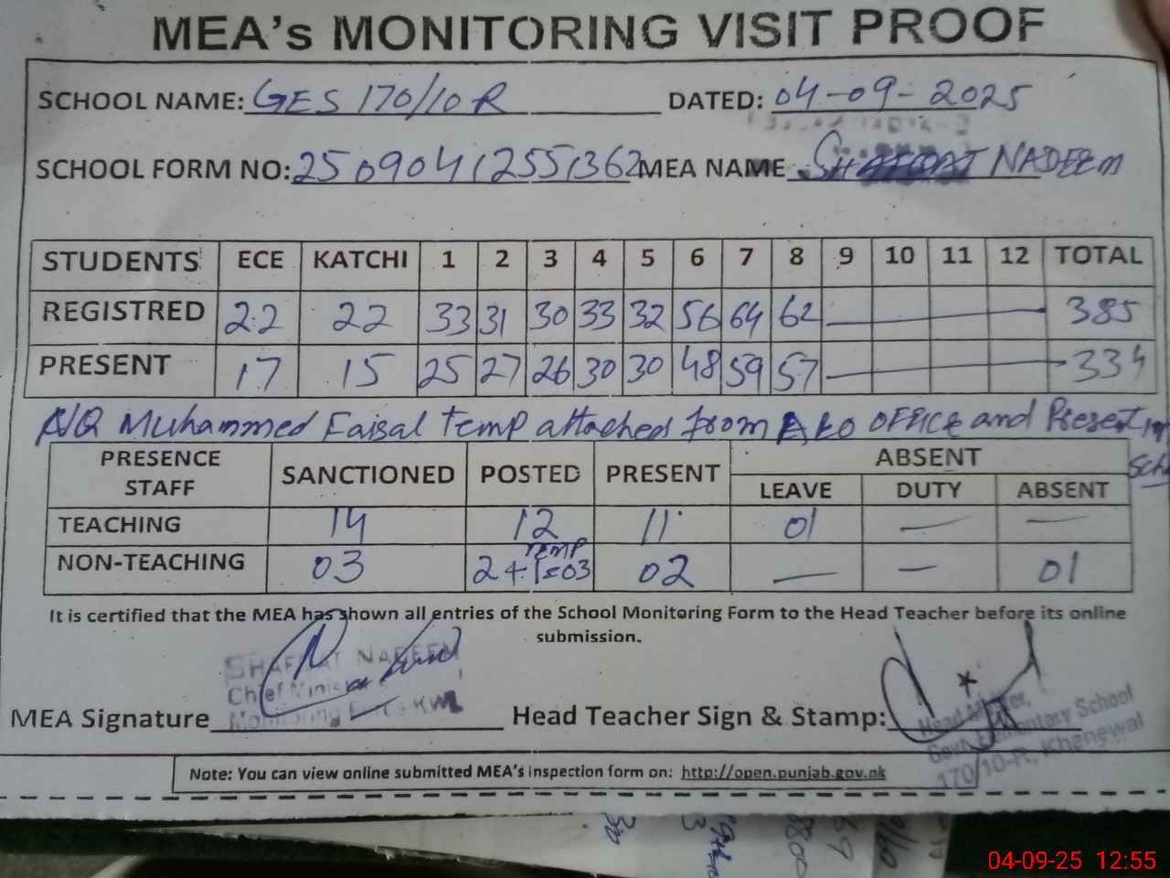 | Attendance Register | Head Teacher | MEA with School | Visit Proof |