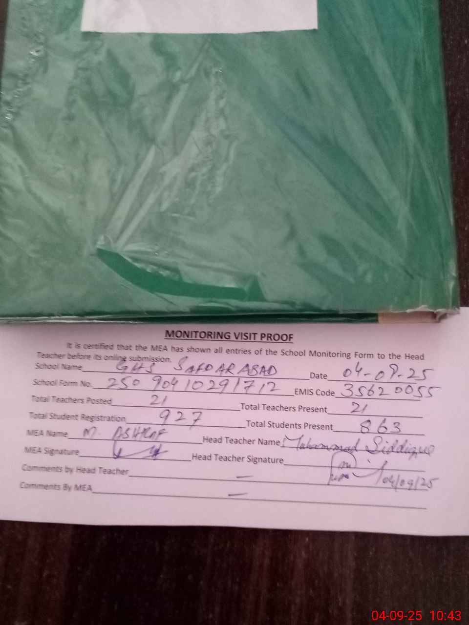 | Attendance Register | Head Teacher | MEA with School | Visit Proof |