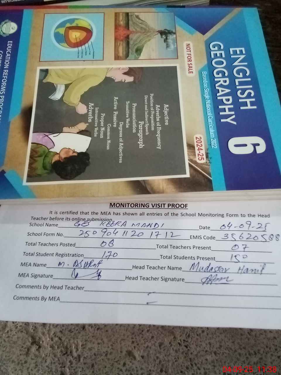 | Attendance Register | Head Teacher | MEA with School | Visit Proof |