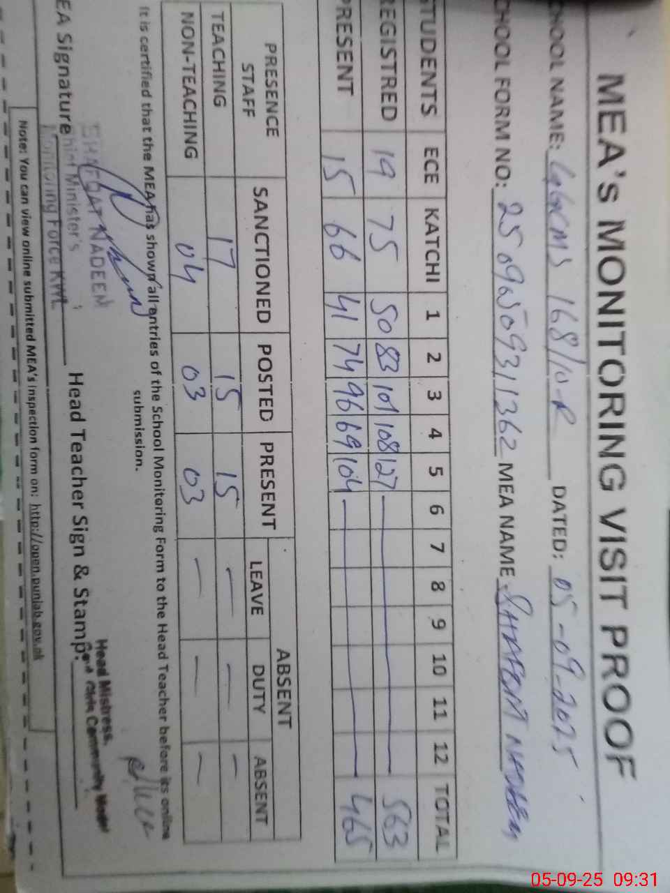 | Certified that this School was Inspected by the Undersigned MEA/DMO Today and the Information Stated Above is as Per Record. | |||||