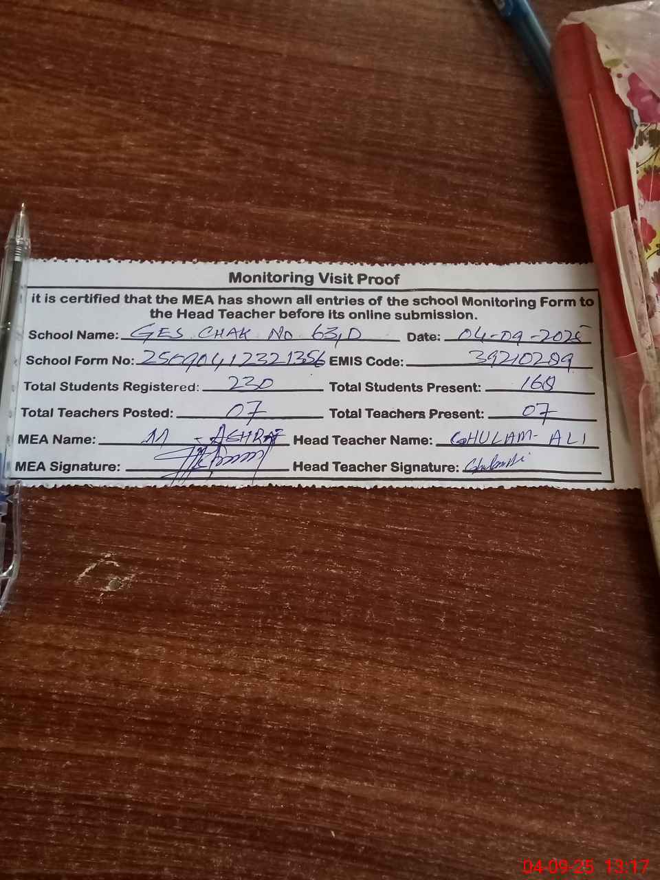 | Attendance Register | Head Teacher | MEA with School | Visit Proof |