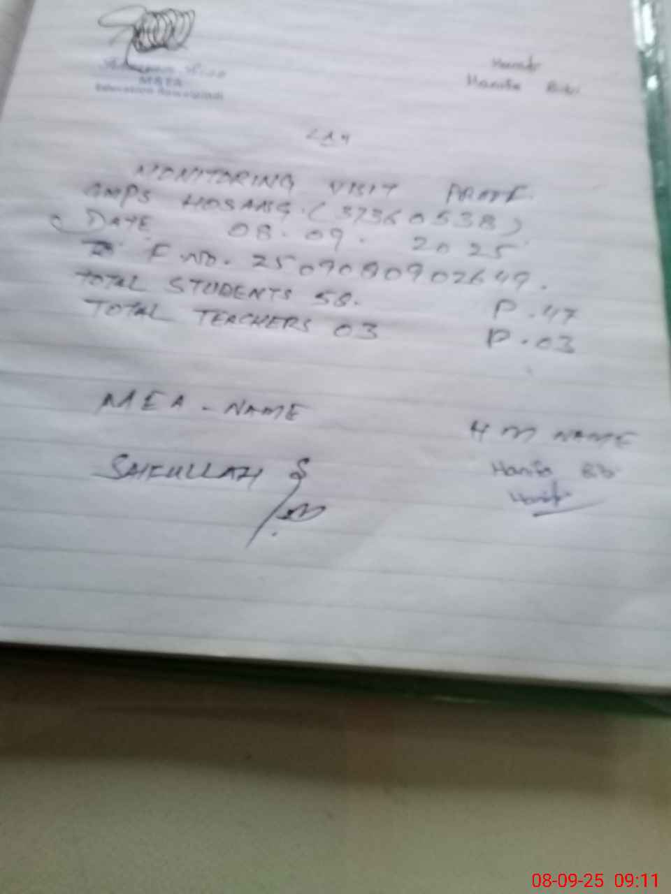| Monitoring Date: 08-09-2025 | Start Time: 08-09-2025 08:54 AM | End Time: 08-09-2025 09:11 AM | Name of MEA: Sa**** | |