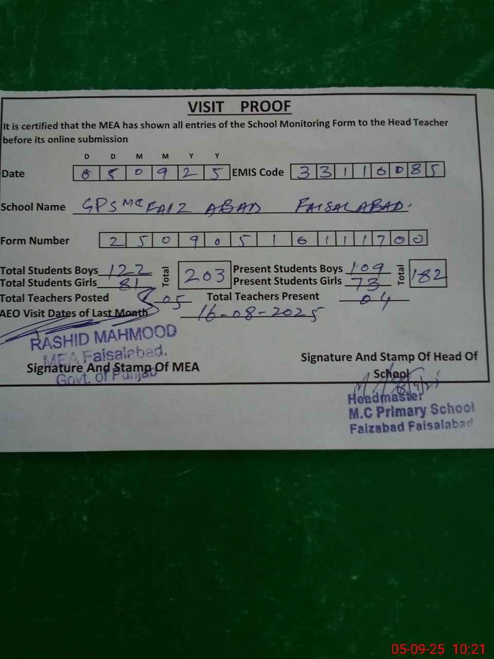 | EMIS Code: 33110085 | Name of School: GPS MC FAIZABAD FSD | |||