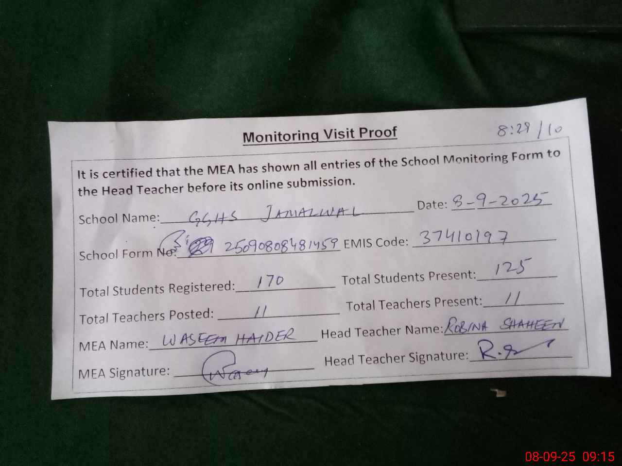 | EMIS Code: 37410197 | Name of School: GGHS JAMALWAL | |||