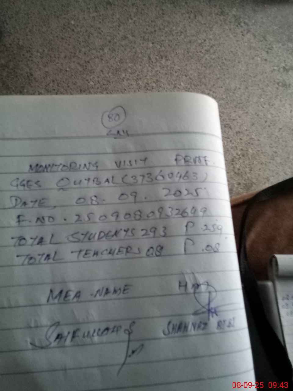 | Monitoring Date: 08-09-2025 | Start Time: 08-09-2025 09:20 AM | End Time: 08-09-2025 09:43 AM | Name of MEA: Sa**** | |