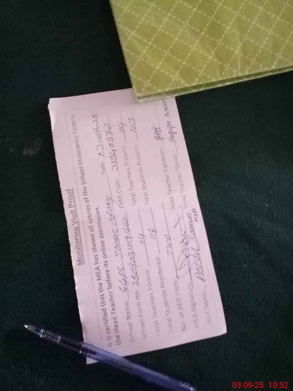| Certified that this School was Inspected by the Undersigned MEA/DMO Today and the Information Stated Above is as Per Record. | |||||