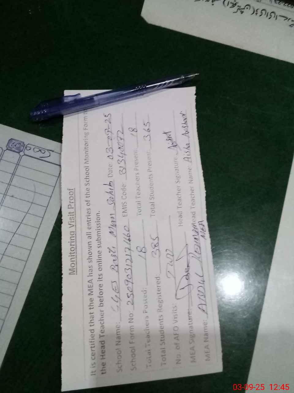 | Attendance Register | Head Teacher | MEA with School | Visit Proof |