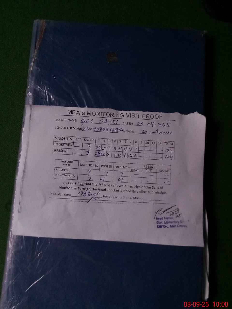 | Attendance Register | Head Teacher | MEA with School | Visit Proof |