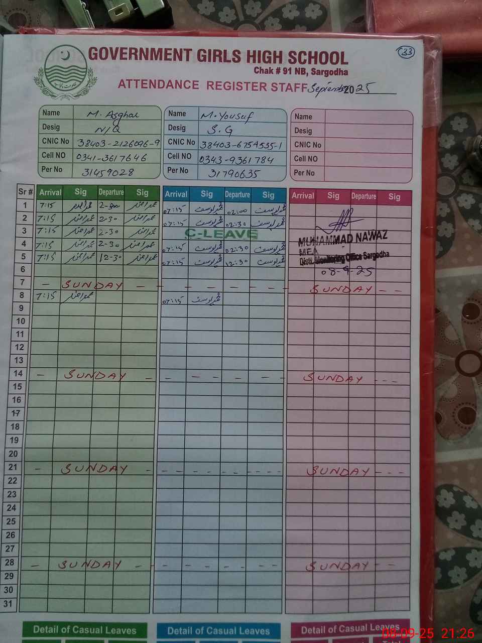 | CNIC | Full Name | Designation | R/C | Absence during last cal. month |
