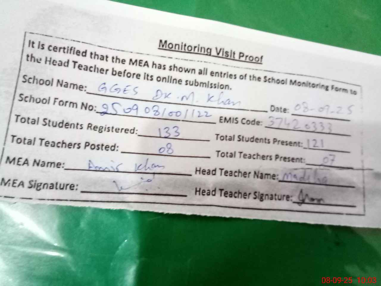 | Monitoring Date: 08-09-2025 | Start Time: 08-09-2025 09:39 AM | End Time: 08-09-2025 10:16 AM | Name of MEA: Am**** Kh**** | |