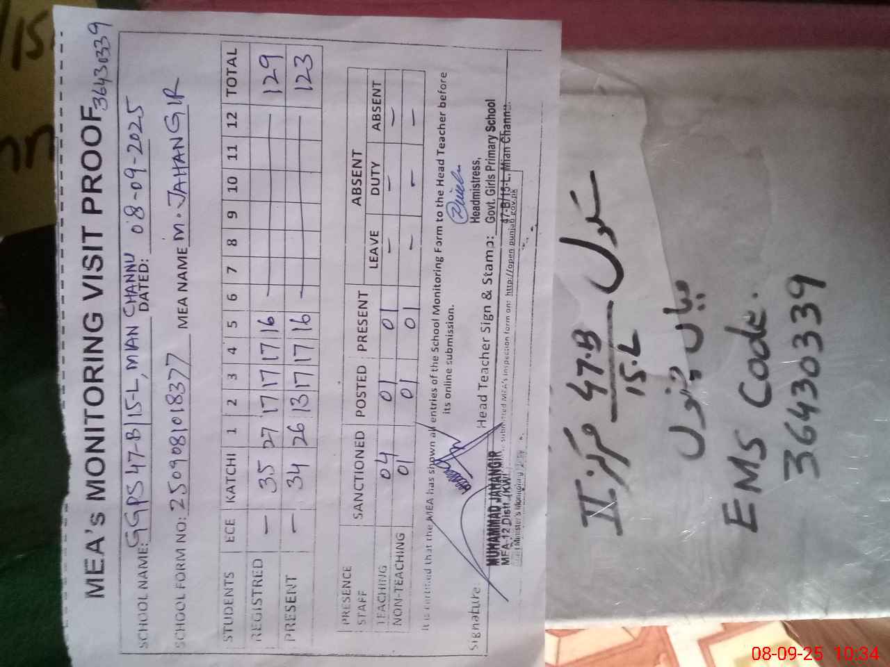 | Attendance Register | Head Teacher | MEA with School | Visit Proof |