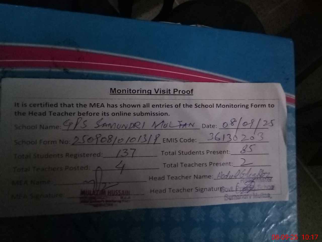 | Attendance Register | Head Teacher | MEA with School | Visit Proof |